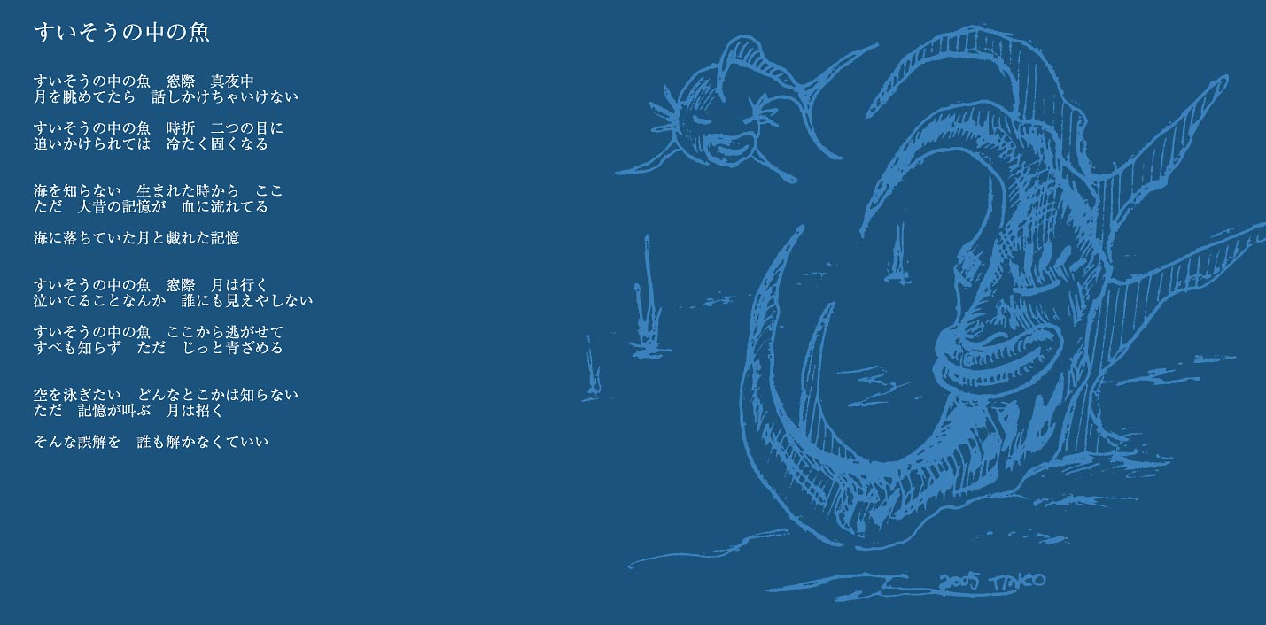 歌詞のイメージから、海の底に沈む月とたわむれる魚を描いた。ボールペンで描いたものをスキャニングし、階調反転。
