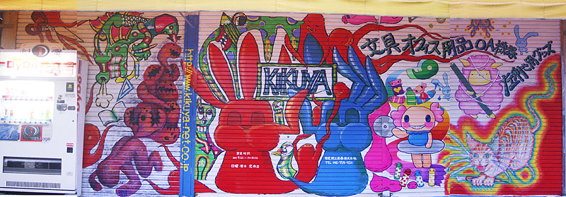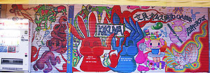 文房具屋のシャッターを6人で共同制作。中央の赤い手青い手とその周りのタコを描いた。