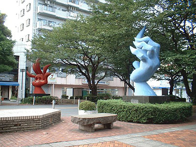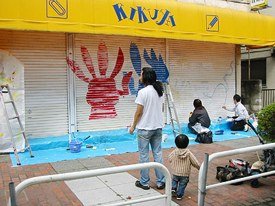 相模原西門商店街のシンボル、岡本太郎作の「呼ぶ赤い手青い手」の修復チャリティイベント、アートフェスタロウの一環として、菊屋のシャッターを描く事になった。