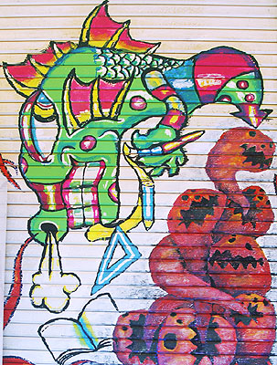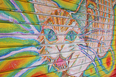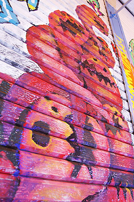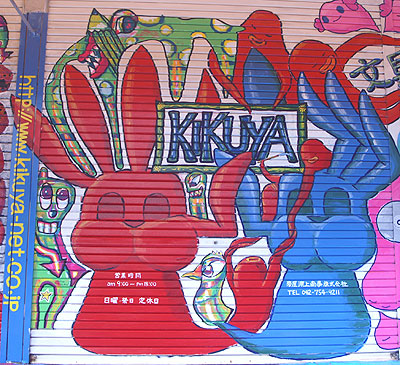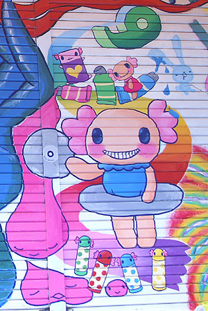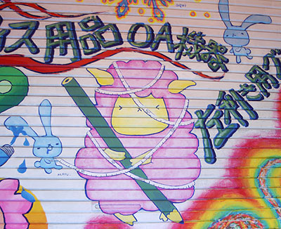 そして完成。掃除、最終チェックも含め3日のつもりだったが、結局4日かかってしまった。やはり屋外での作業は天候しだい。多少余裕をもったスケジュールで臨みたい。そして今回は全てが勉強になったと言っても良い。ただ自由に描けば良かった「キサラギハニーPROJECT」「デザインフェスタギャラリー壁画」とは明らかに違う。そこにはオーナーの意向や、商店街の皆さんの反応があり、一筋縄ではいかないものを感じた。今後もこの経験を生かして、皆に喜んで頂けるモノをどんどん描いていこうと思う。