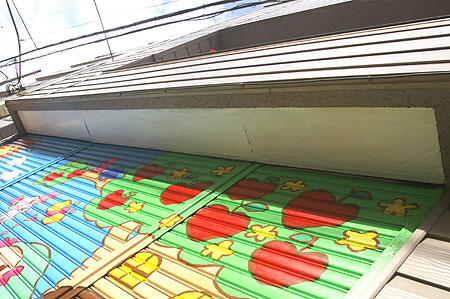 それほど大きくはないシャッターだが、夜になると街灯もなく、手前には植木や理容店のグルグル(←名前あるのか?)、さらに歩道が狭いという悪条件の中、掃除、白塗り、制作まで、全て UPAKO 1人でがんばった。
