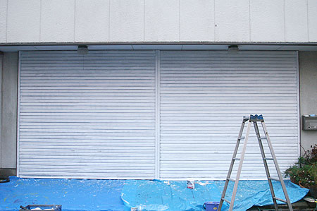 UPAKO の描いた床屋シャッターのニス塗りを終え、こちらのシャッターの掃除と白塗り開始。さほど汚れていない印象ではあったが、やはり汚い。それでも要領がだいぶ掴めてきたので作業もはかどる。白塗りも凸の部分を先に塗り、ある程度乾燥させてから凹の部分を塗ると、隙間から水が流れ出しても、塗ったペンキが一緒に流れ落ちないという事を知る。