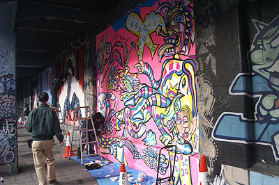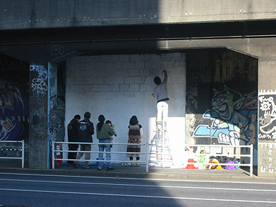 元々グラフィティで有名なこの高架下。合法的に絵が描けるように解放しようという企画のようで、申し込みが多い場合抽選との事。グループとさらに個人でも申し込んでいたにも関わらず、仲間内で抽選に当たったのは移動マッサージ1人。やはり今、波に乗っている彼には運も味方しているようだ。